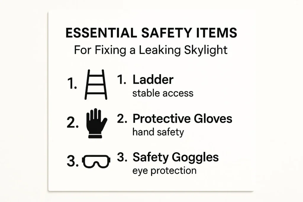 Safety should always be your top priority. Use a secure ladder and have someone assist you, if possible. Before even touching the skylight, gather the necessary safety equipment. The infographic below illustrates the essentials: