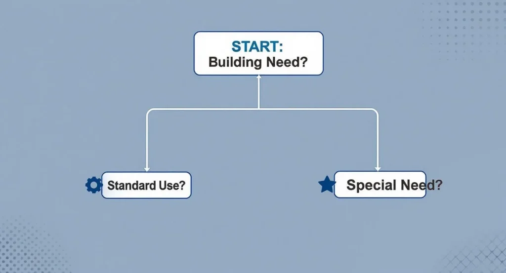 The flowchart simplifies the choice by starting with your core building requirement, guiding you toward a material that aligns with either standard use or more specialised environmental demands.