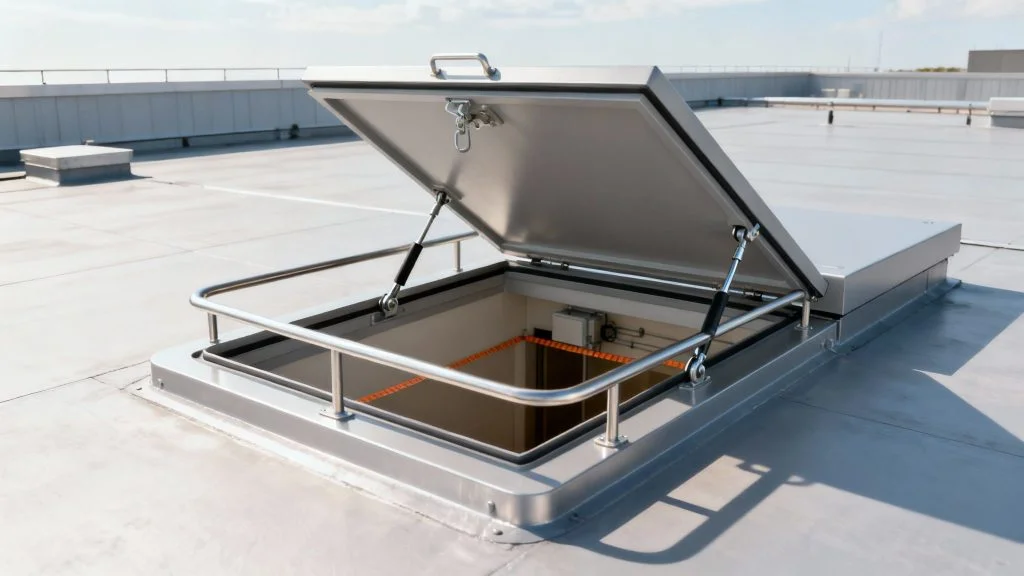 - Guardrail Integration: A properly compliant installation will always include permanent guardrailing around the hatch opening. This creates a secure zone, giving workers a safe perimeter the moment they step onto the roof.