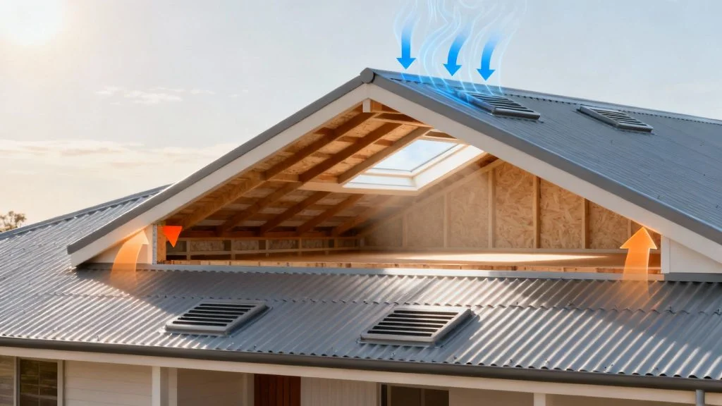 The fix is straightforward: aim to split your total Net Free Area (NFA) roughly 50/50 between low-level intake vents (in your eaves or soffits) and high-level exhaust vents (at the ridge or with operable skylights). Getting this balance right is the foundation of meeting the roof ventilation requirements Australia demands for effective airflow.
