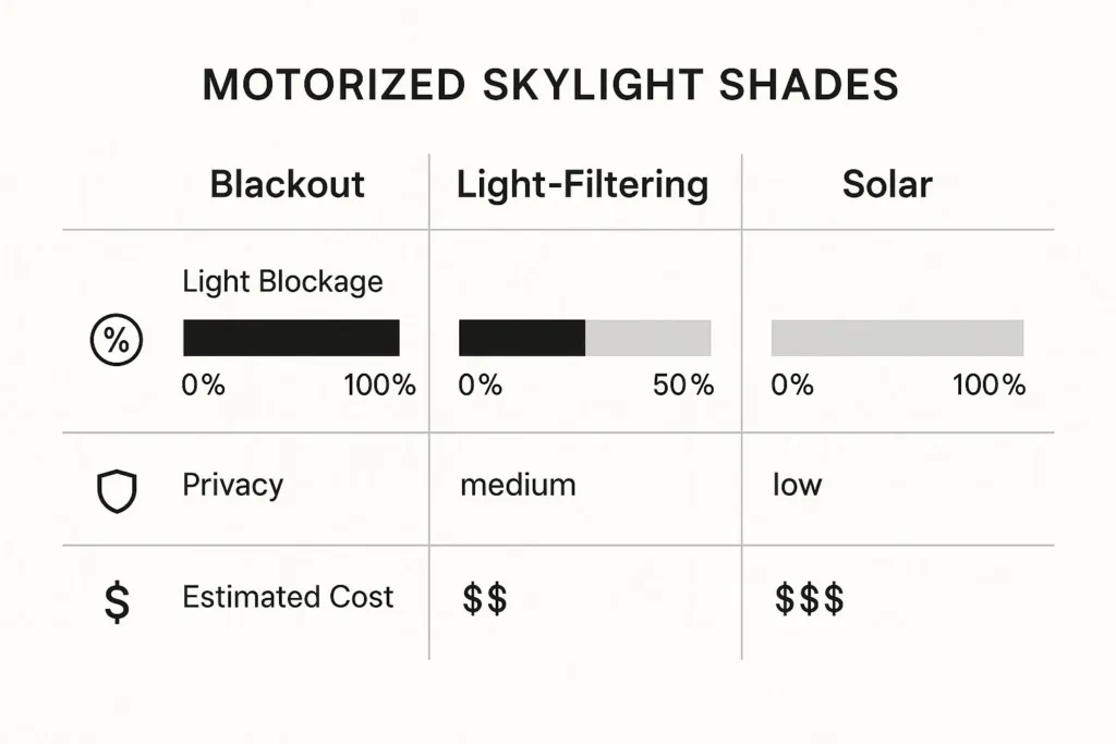 • Battery-Powered Systems: Super flexible and perfect for adding shades to existing skylights without the hassle of new wiring. The batteries last a long time, are rechargeable, and are a breeze to manage.