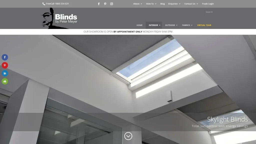 | Blinds by Peter Meyer | Moderate to high – custom-made with motorised options | High – custom fabrication and consultation | High – total sun control and insulation | Residential and commercial skylights | Wide fabric/colors, expert consultation, durable materials |