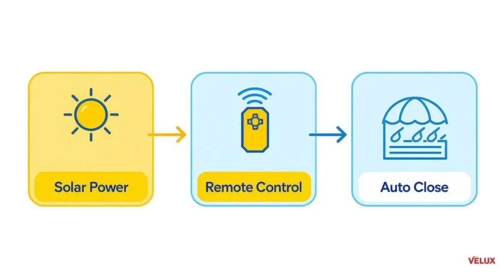 Think of it as a tiny, self-contained power station sitting right on your roof, dedicated entirely to your skylight. It’s a clever system that combines three core parts to give you effortless control, all without ever needing to connect to your home’s electrical grid.